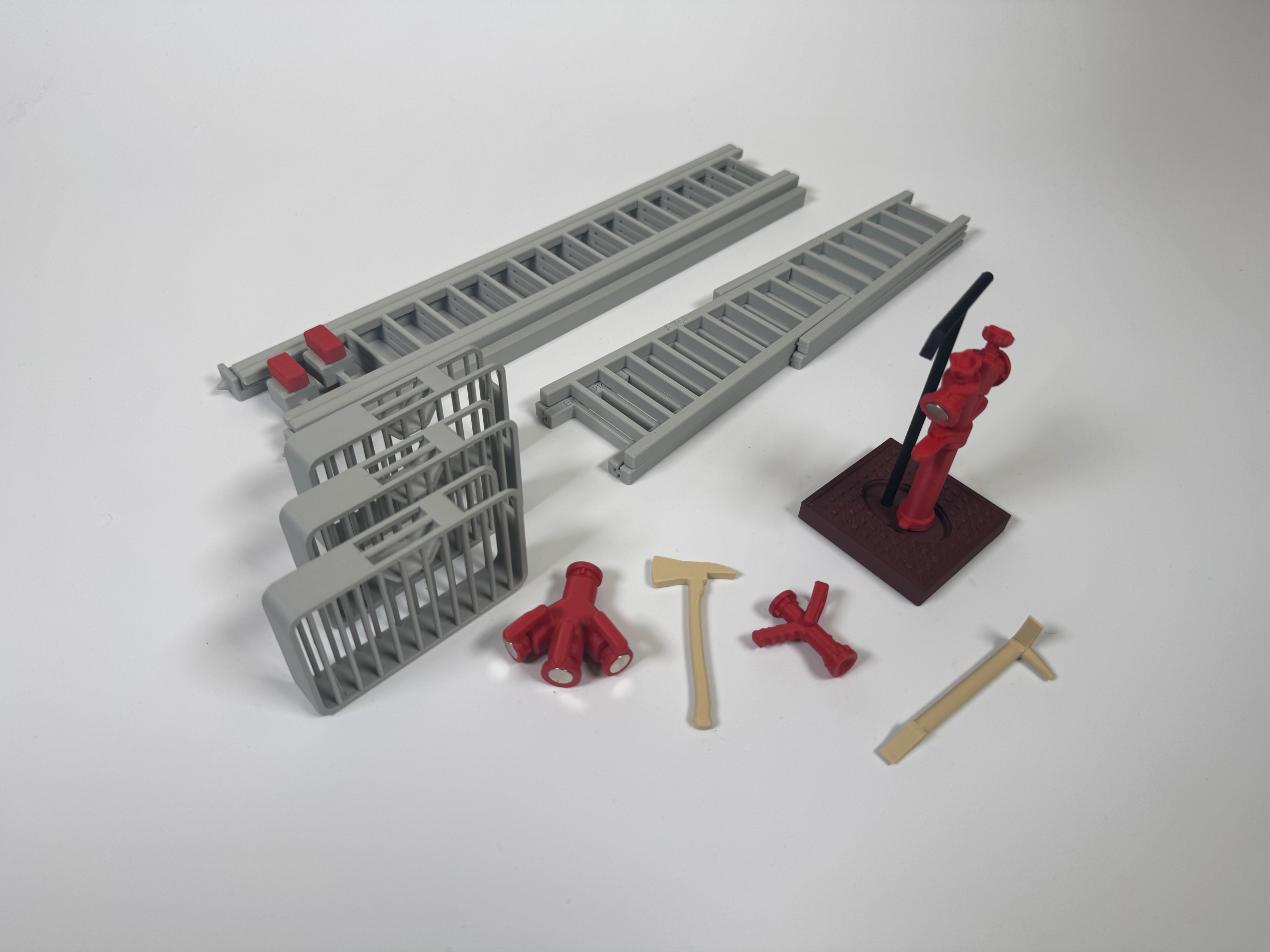 Einsatzmittelset ohne Schlauch: Maßstabsgetreue Nachbildungen aller enthaltenen Einsatzmittel zur direkten Positionierung am Taktik-Trainer (Axt, Verteiler, Standrohr, Standrohrschlüssel, Hohlstrahlrohr, Steckleiter, Schiebleiter, Schlauchtragekorb)