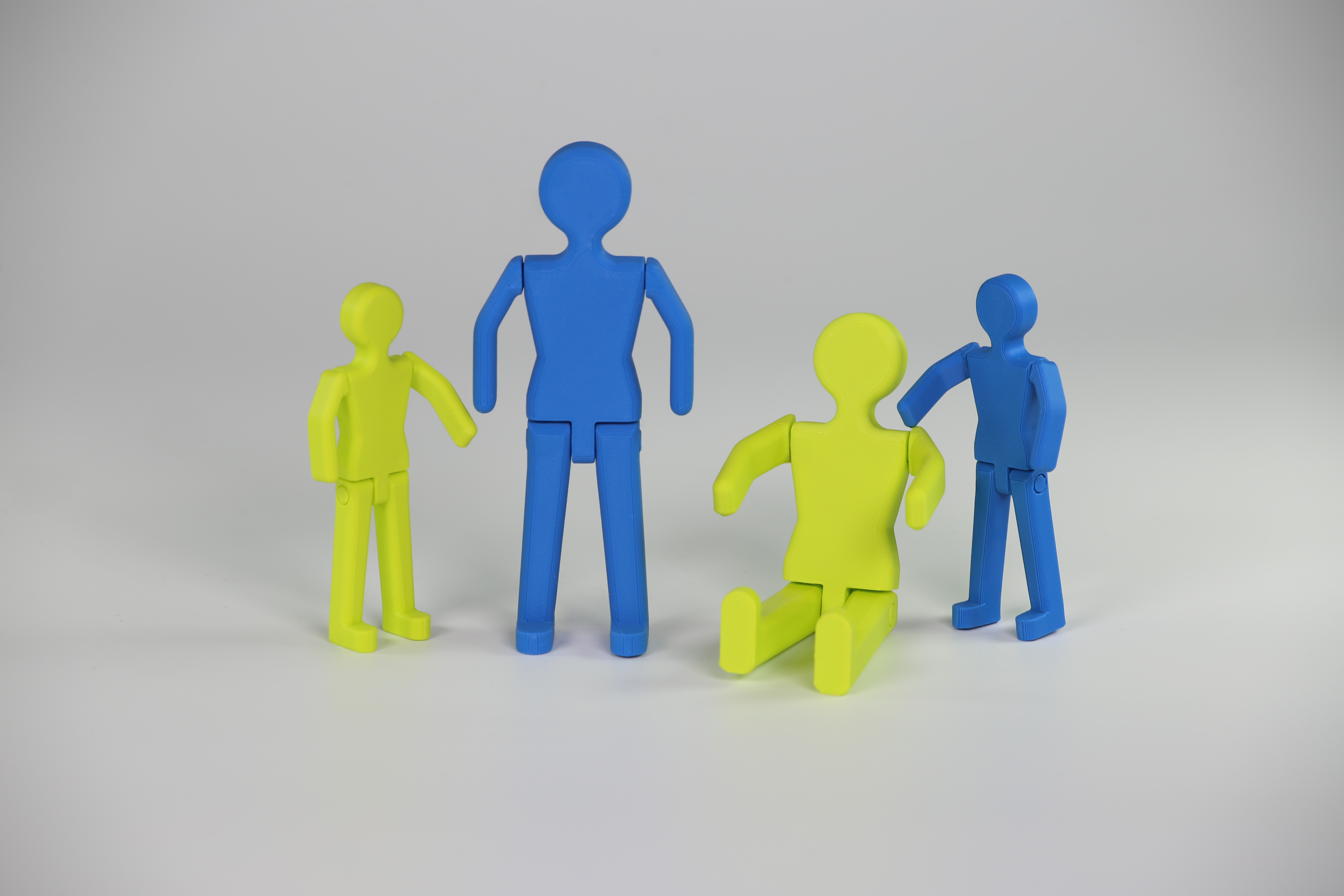 Vier Personenfiguren in blau und grün für realistische Übungsszenarien im Taktik-Trainer. Einsetzbar als Bewohner, Einsatzkräfte oder Übungspunkte.