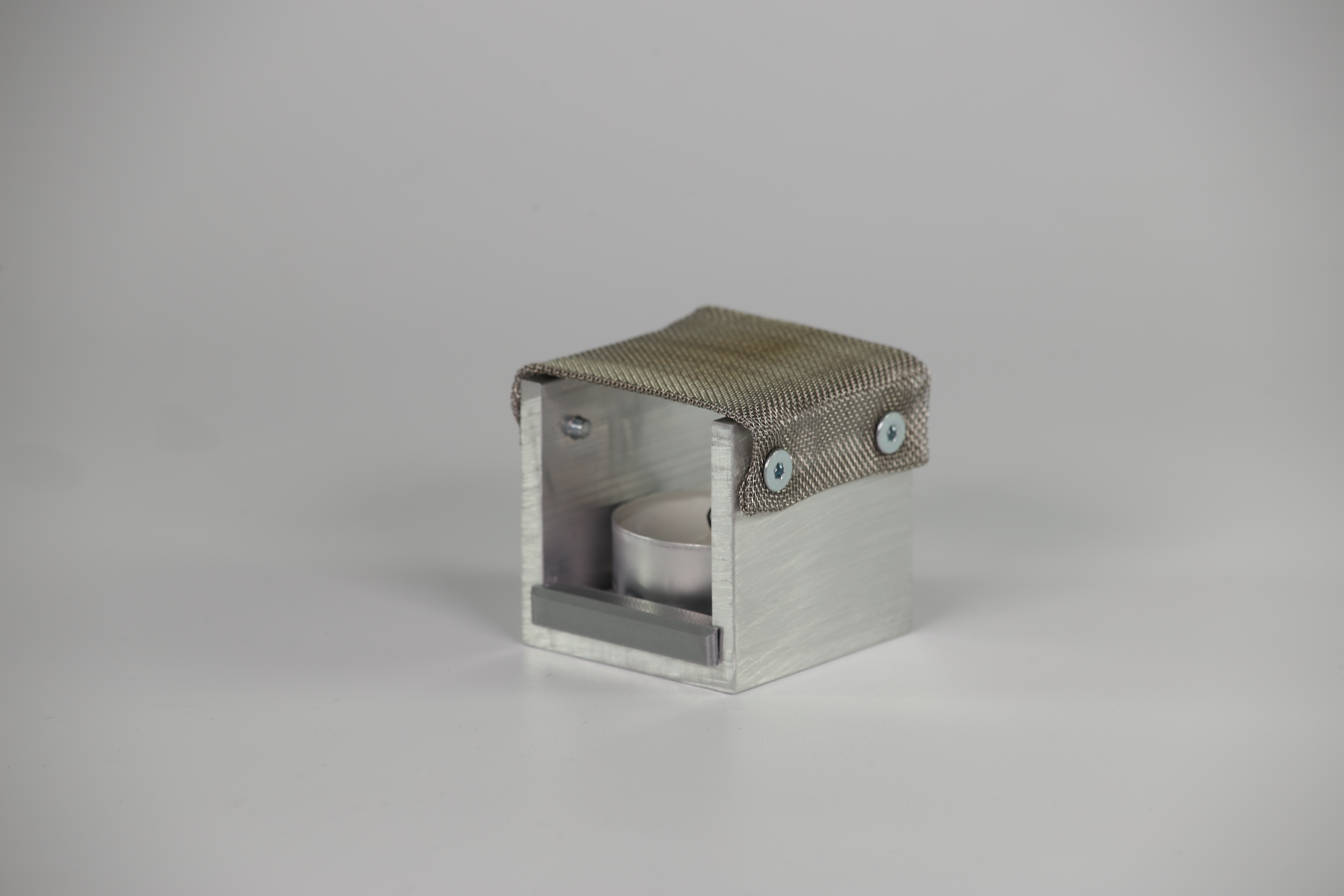 Ein Teelicht kann sicher in die vorgesehene Halterung eingesetzt werden, um eine kontrollierte Wärmequelle zu schaffen. Dies ermöglicht praxisnahe Trainings zum Rauchverhalten und zur Entrauchungstaktik.